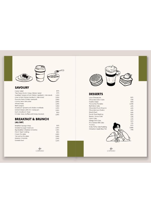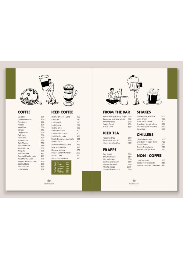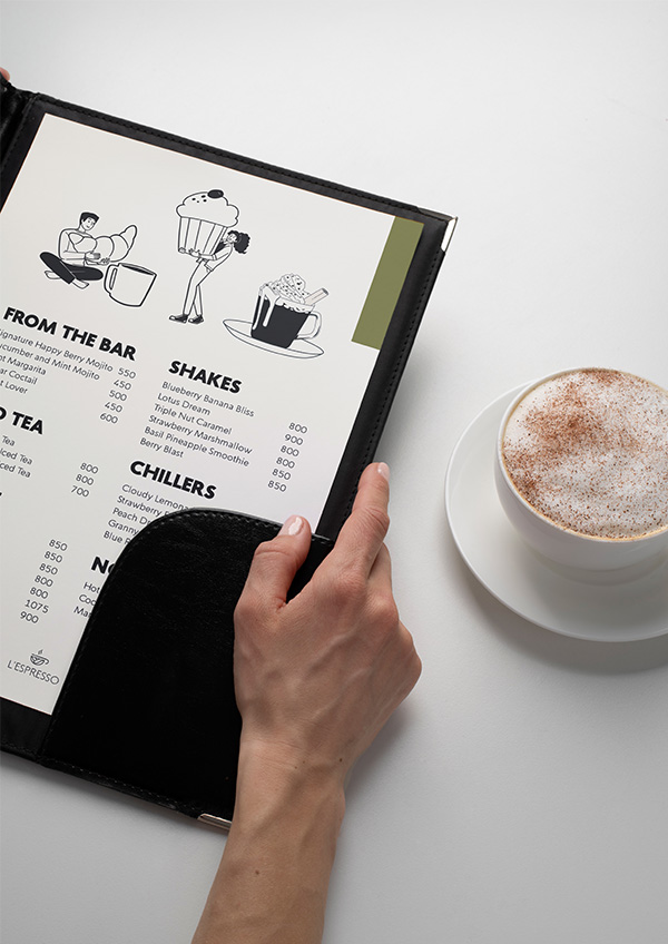 These bespoke menu set designs are inspired by the doodle style mural of L’espresso. The styles stays true to the brands’s essence and adds value to the overall ambience of coffee drinking experience at the cafe.